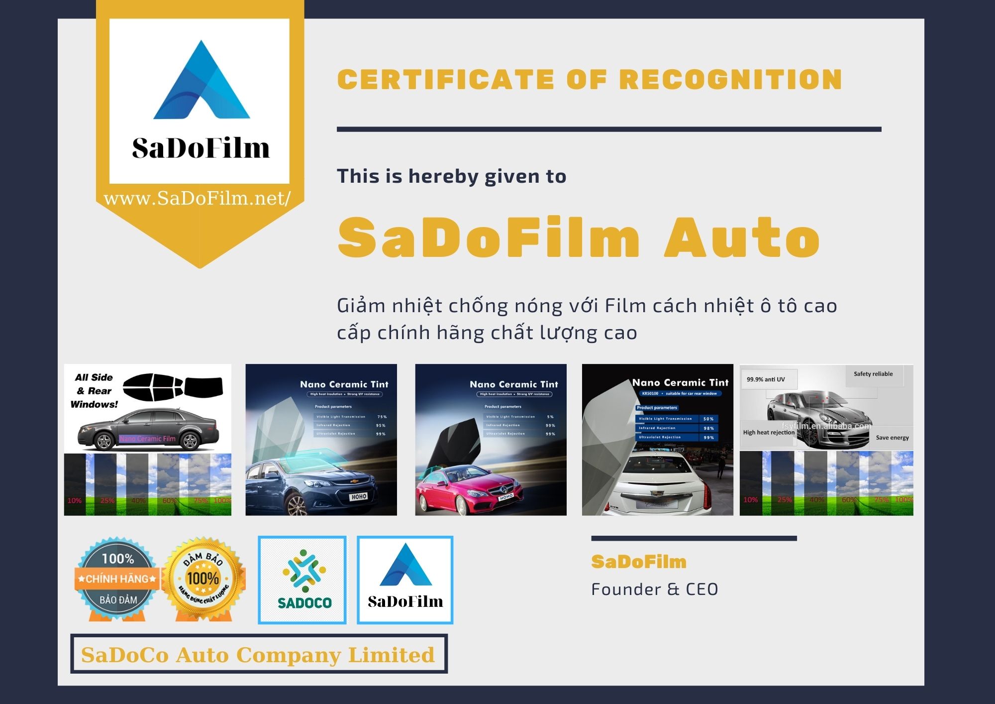 Với công dụng và hiệu quả của mình khi bạn dán phim cách nhiệt ô tô cao cấp SaDoFlim chính hãng mà công ty SaDoCo đã tìm hiểu và trãi nghiệm trên hàng nghìn xe đã thi công và lắp đặt hiệu quả, SaDoCo tự hào là nơi cung ứng phụ kiện dán phim cách nhiệt ô tô Cao Cấp SaDoFilm chính hãng. Với phương châm sức khỏe của bạn là quý nhất, chúng tôi chỉ nhập sản phẩm chất lượng nhất, hiệu quả nhất.
